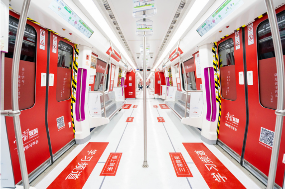 本次“學習強國”專列共6節(jié)車廂,運行全長33.5公里,連接5大行政區(qū)、7大換乘站、市政中心、CBD金融中心,貫穿大學城。4號線的乘客人群以城市白領和高校學生為主,是極富學習熱情和學習能力的人群。“學習強國”專列的開通,是建設學習型社會,打造學習型城市的生動實踐和有效舉措。將激發(fā)更多的中青年自覺參與到學習中來,讓學習平臺發(fā)揮更大的學習效應。除4號線的地鐵專列,地鐵1、2、4號線的進出站點均布置了相應的燈箱廣告。據(jù)測算,每天各站點客流總量達到500萬人次。